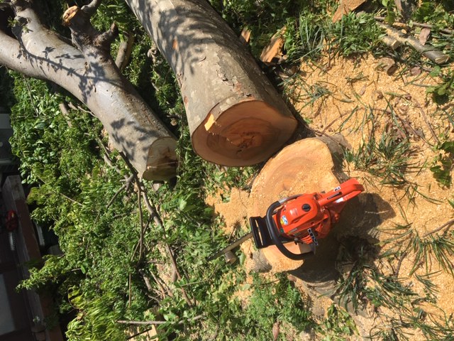 幸い今回は木の重心が建物や塀に傾いていませんでしたので、自然落下を前提にした枝落し・幹のカットでした。